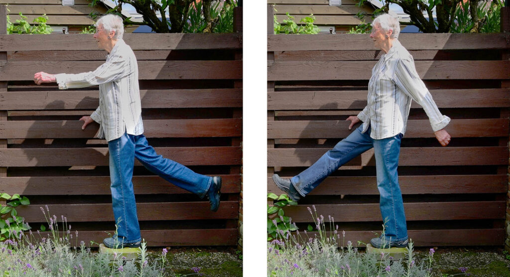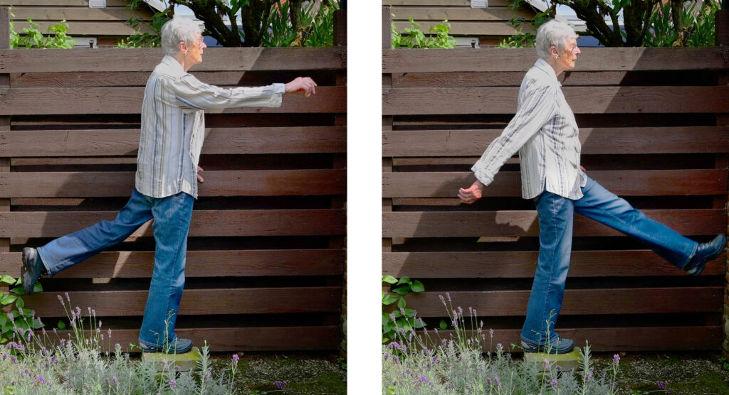 We kunnen de één-been-spier en ook de voetspieren versterken door die beurtelings te belasten en te ontspannen. D.w.z. één simpele oefening heel vaak herhalen.